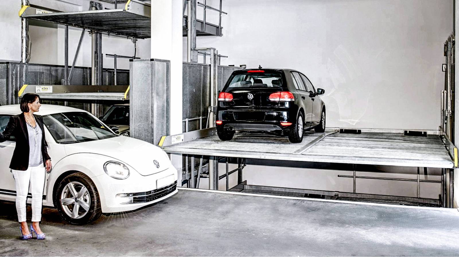 Reduced headroom created by "tilting": upper platform with horizontal access, lower platform sloped: 8°/14,1 %. If overall headroom is available, systems with higher clearances between platforms can be supplied. Single units for 3 cars and double units for 6 cars.