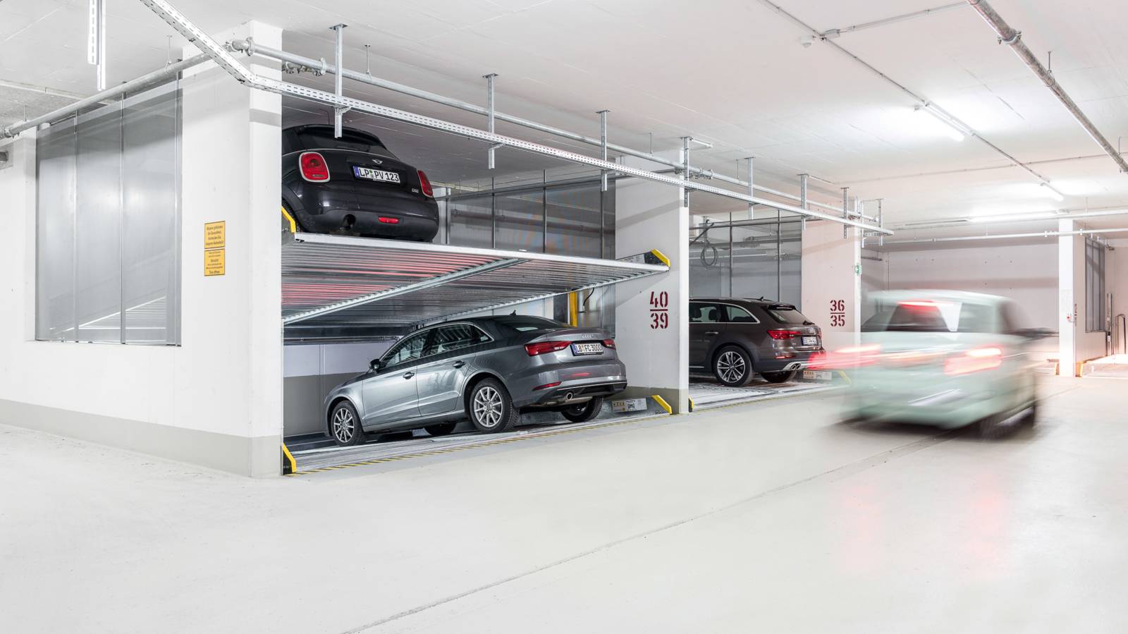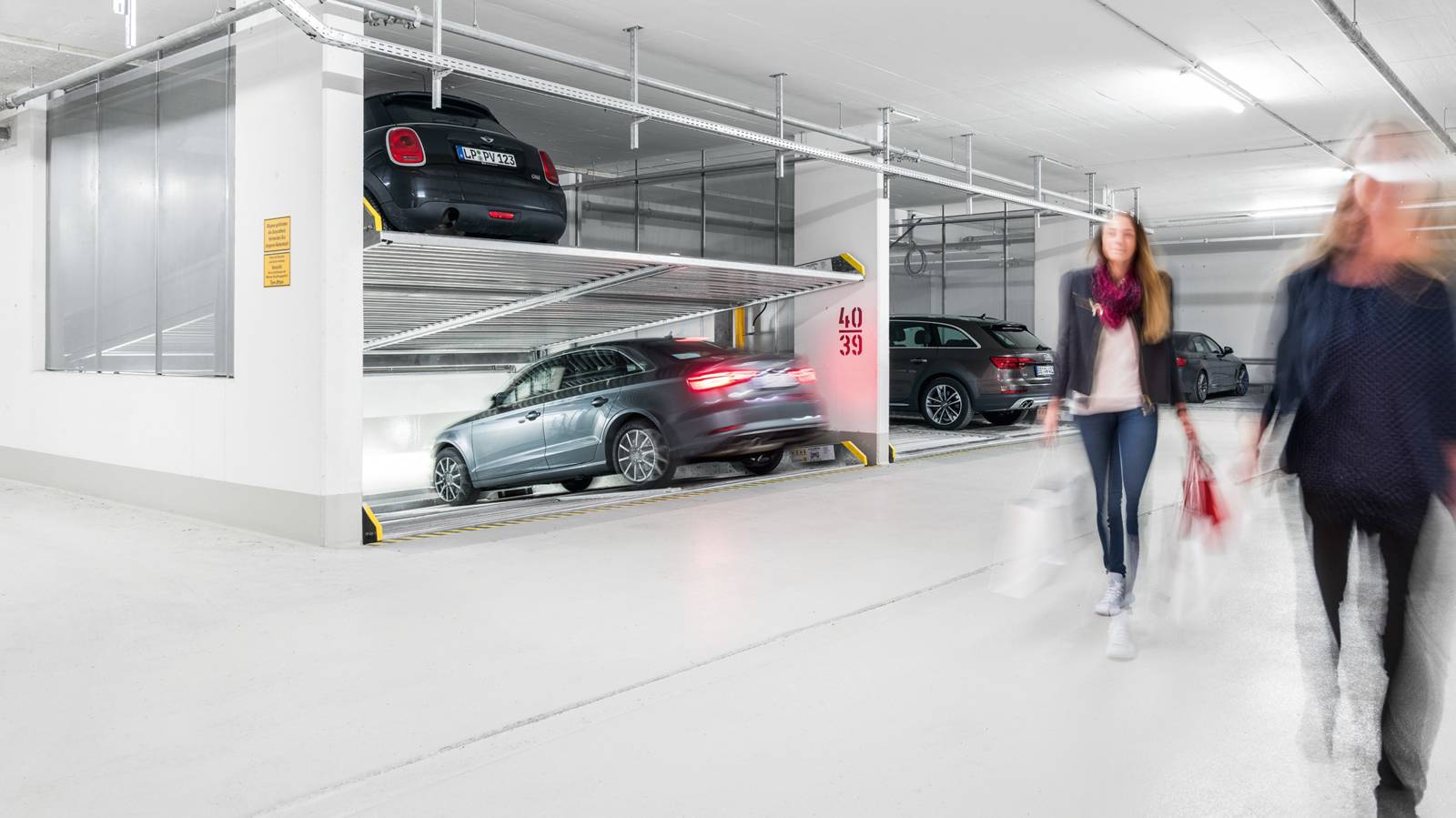 - 1 driving lane = 2 parking levels = cost savings