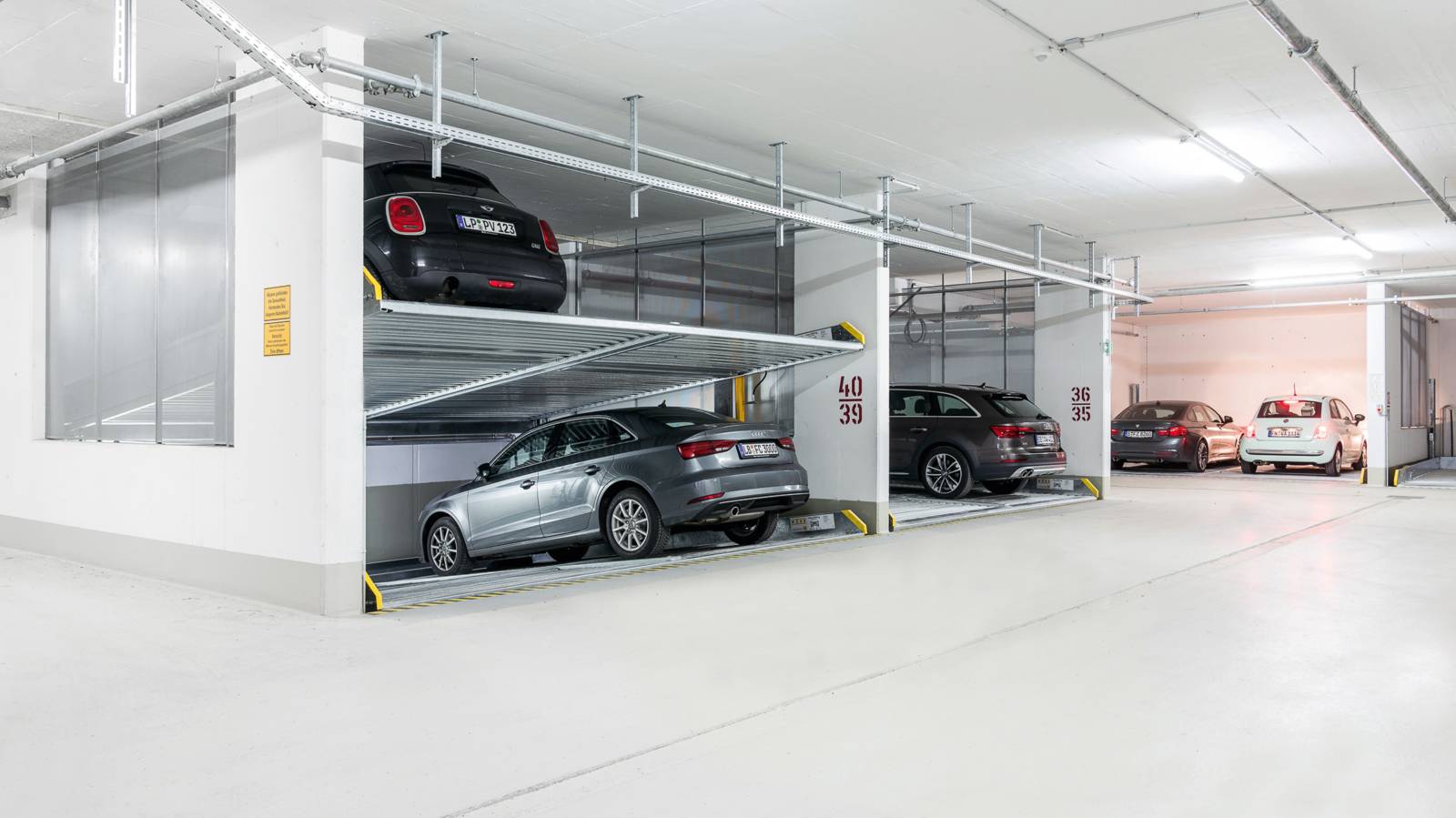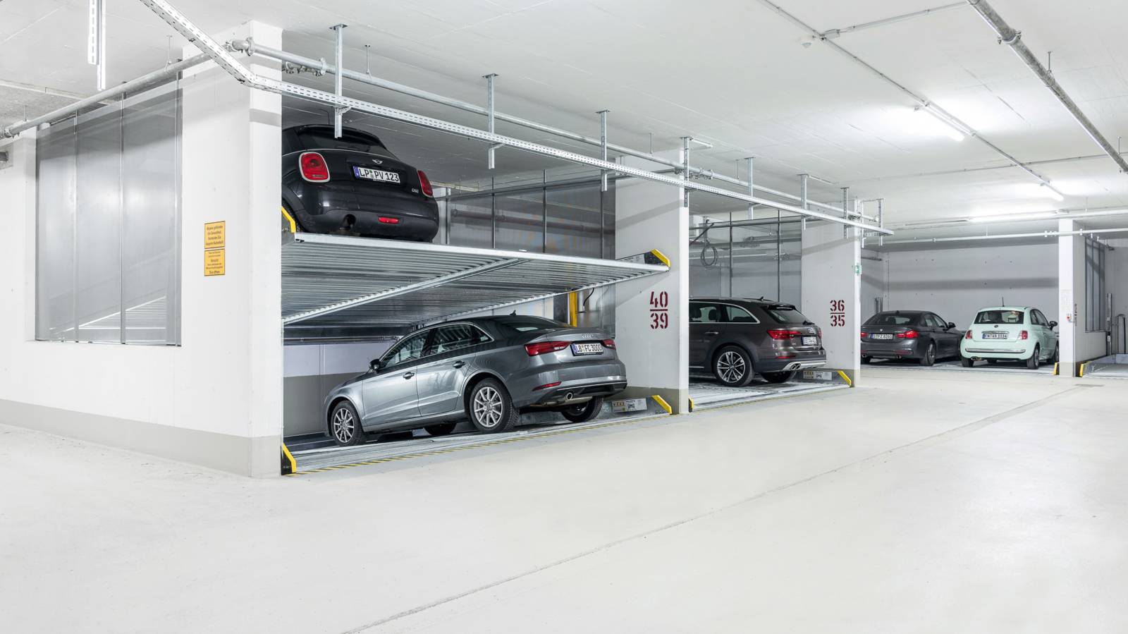 The new Parklift 405 enters the market with the same innovations as the Parklift 450 and also has a further advantage. With even lower ceiling height, the same sized vehicles can be parked as in the Parklift 450, while the lower parking space is inclined. This is a response to growing car dimensions and shrinking space size. The lower platform is accessible with a gradient of 14 %. The upper platform has a minimum inclination of 2 %, which helps with drainage of the upper parking space. The single system is for 2 cars, the double system for 4 cars.