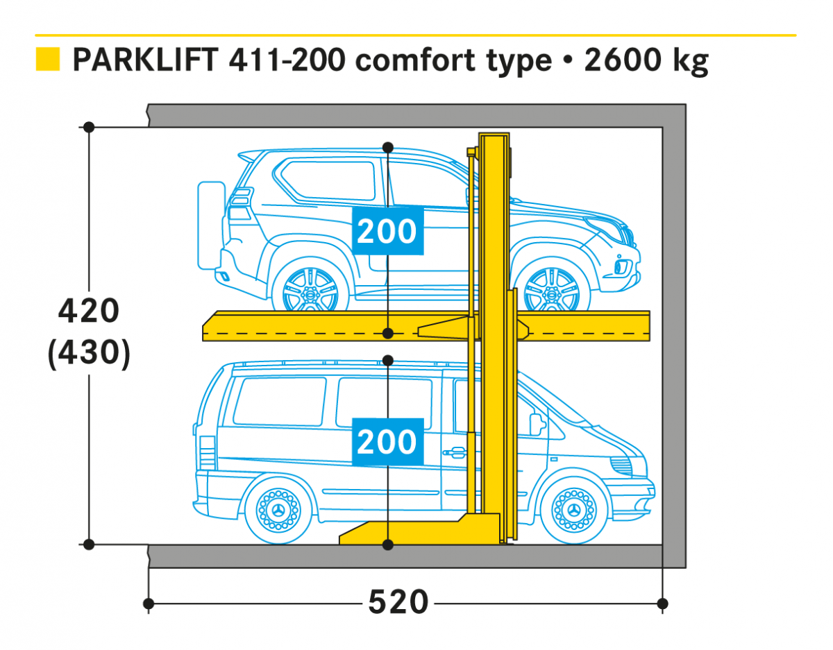 Dependent parking means: the lower car has to be removed to use the upper platform. If sufficient installation height is not given indoor, the Parklift 411 can ideally be suited to outdoor installation with an additional equipment. Single unit for 2 cars and double unit for 4 cars.